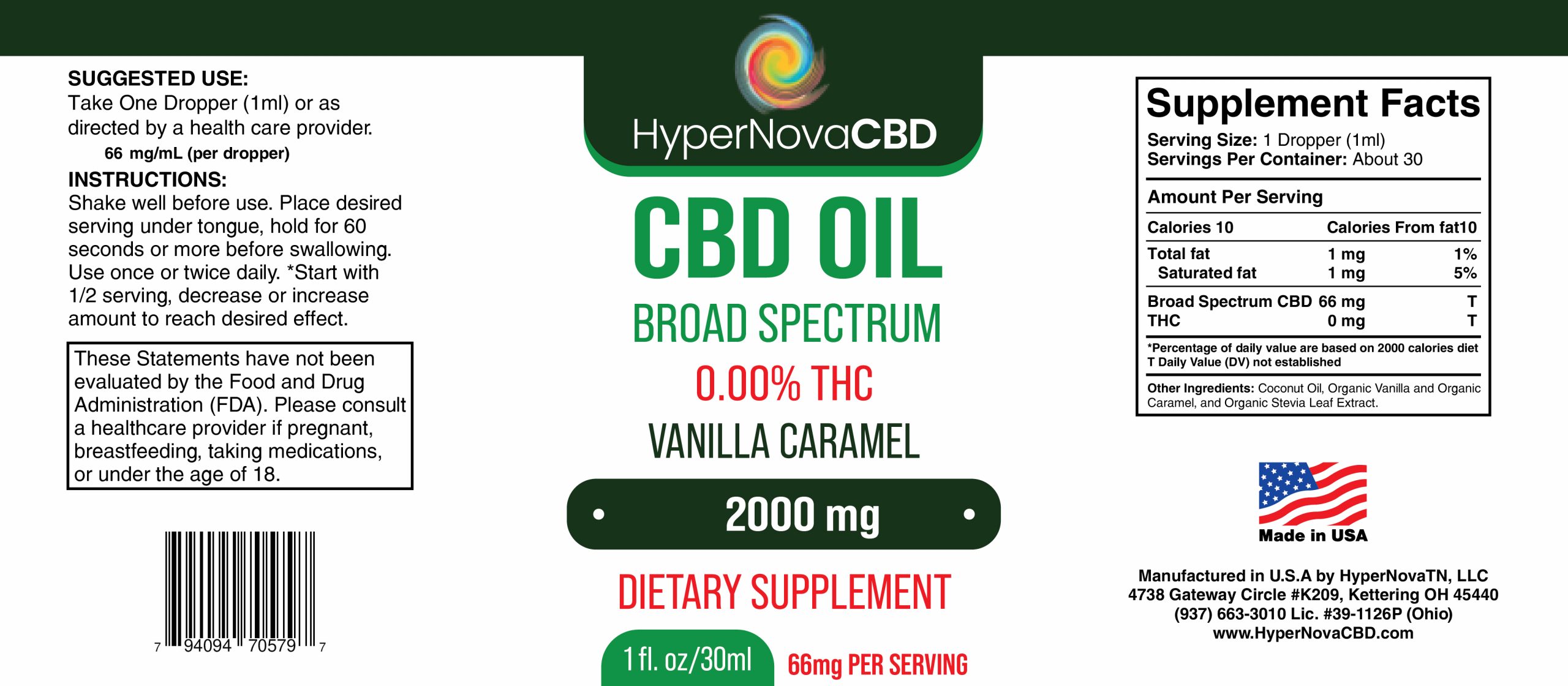 Organic MCT Oil (fractionated Coconut Oil), BroadSpectrum CBD oil, Organic flavor (Vanilla Caramel)